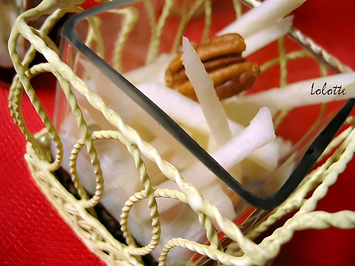 Une fois que la gelée est prise, remplissez chaque verre avec la mousse (environ 2 cs/verre). Terminez par quelques bâtonnets de poire et une demi-noix. Servez frais ou à température ambiante, avec des cuillères.