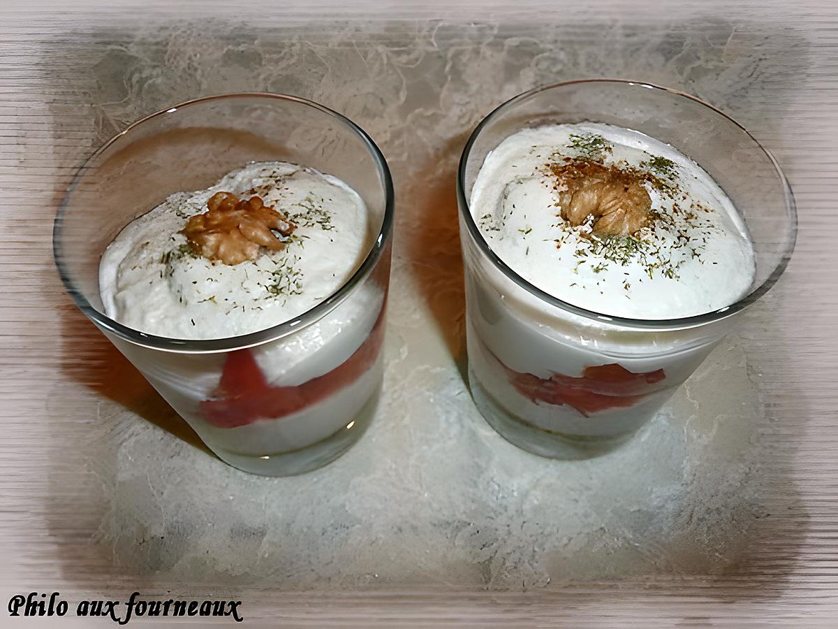 Verrine de mousse de concombre au chèvre, aux noix et ses dès de tomates